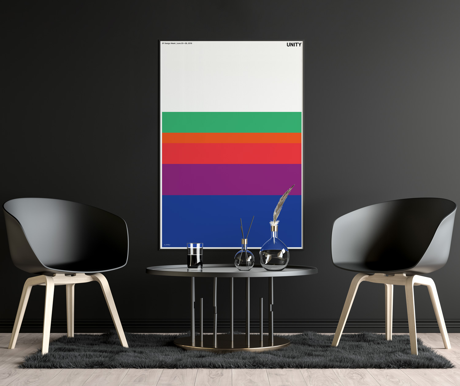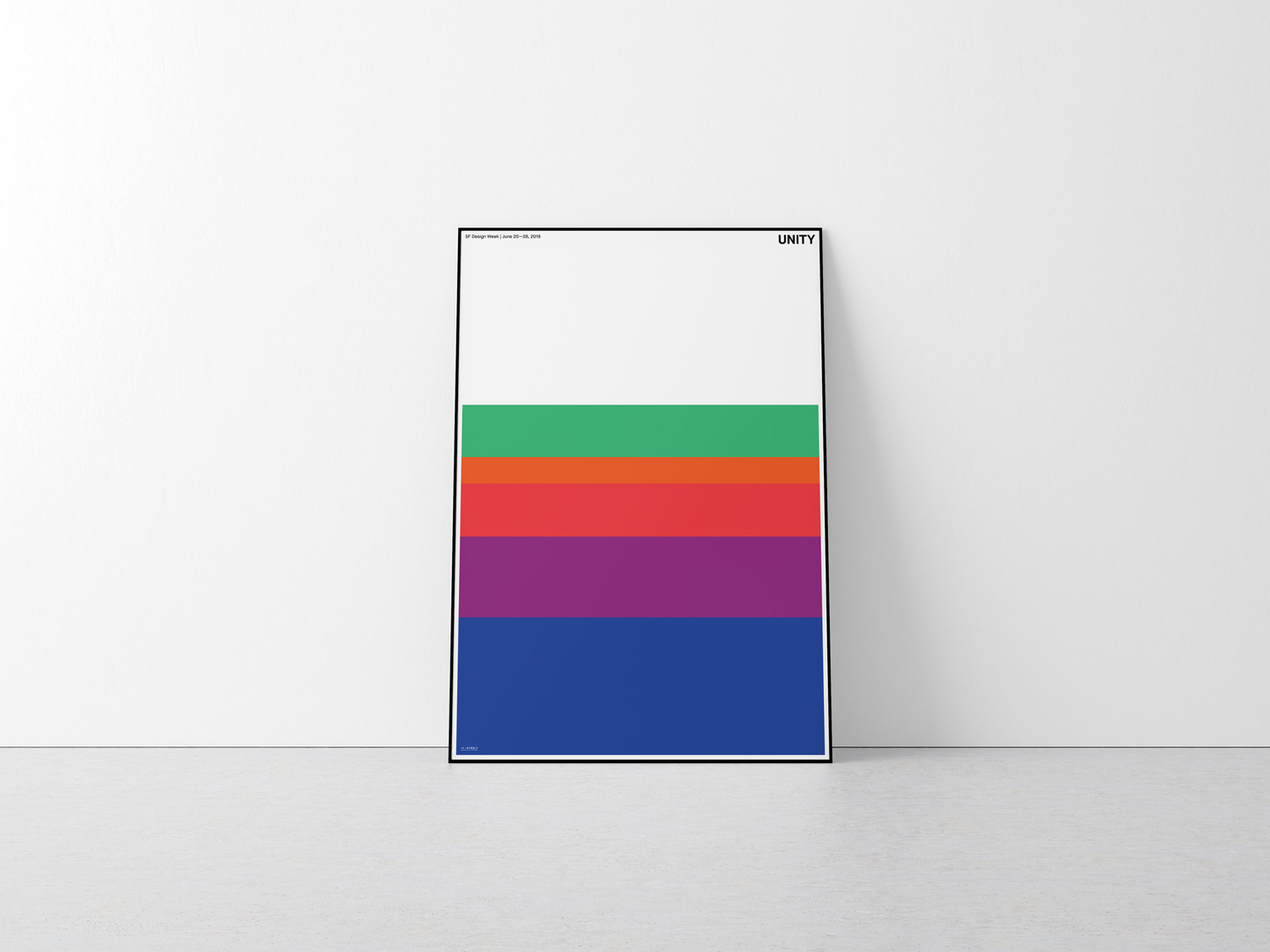 • This poster uses bold reductive forms and interplay of color, portraying a crowd of people standing together, representative of ‘Unity’ and the state of being united.
