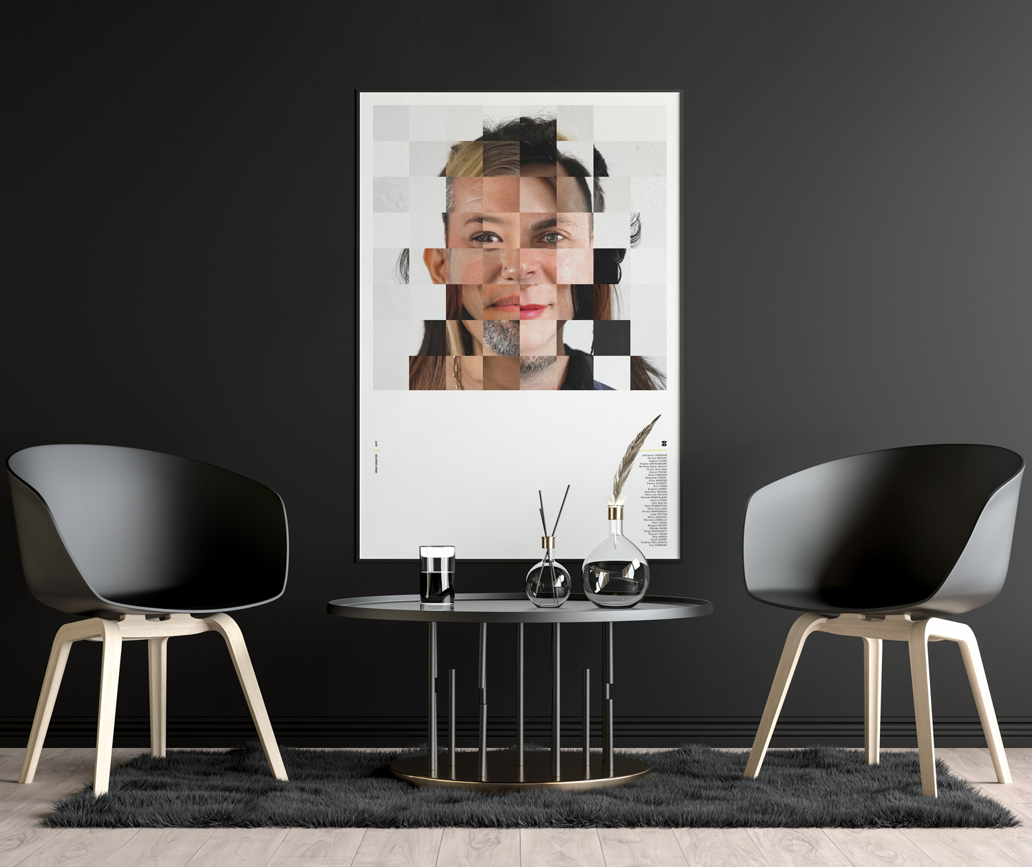 This poster explores the myriad ways the individual team members interact with one another. It is both analog and digital, reflecting our own metamorphosis from traditional to digital.