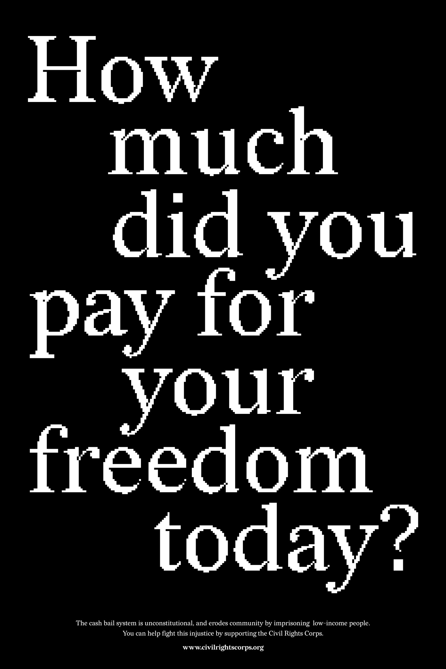 This is based on a project by myself and Forest Young. It’s a typeface that was commissioned for a show at MoMA PS1 highlighting the injustice of the cash bail system and the people whose lives are affected by it. We made a custom typeface that was used in the artwork, and also created a website to promote the work and distribute the fonts for free personal use.